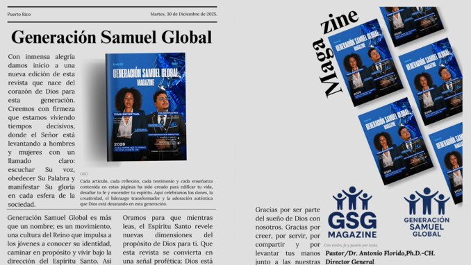 Con gran gozo y visión global, Generación Samuel Global anuncia el lanzamiento oficial de su primera revista internacional: Generación Samuel Global Magazine – Edición Especial de Navidad, una publicación diseñada, escrita y producida por jóvenes apasionados por Dios, desde diferentes naciones, bajo la cobertura espiritual y dirección del Pastor/Dr. Antonio Florido(Director General), y el liderazgo creativo de Magdiel Cabrera (Mega) como Vice-Director y Director Creativo.